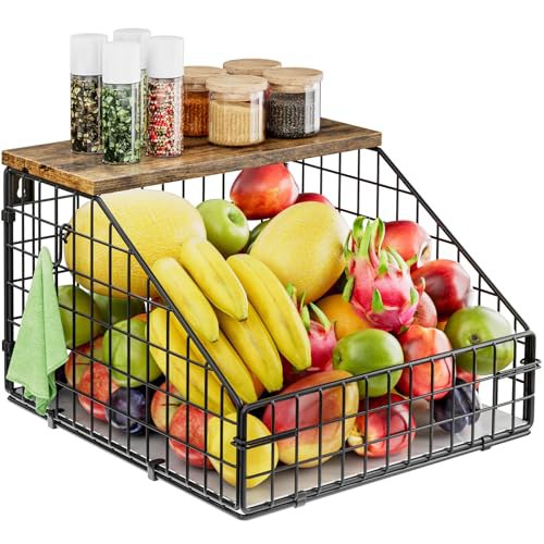 Cisivis Obstkorb, hängende Obstschale, Obst- Pirαtе-Dеαl~s und Gemüseaufbewahrung, Wandmontage, stapelbares Obstschalenregal mit Holzdeckel, Küchen-Organizer, hängender Obstkorb, Metall-Obstregal, groß