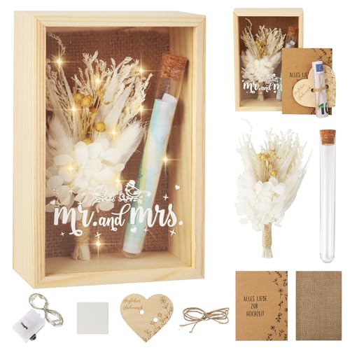 Hochzeitsgeschenke für Brautpaare,Geldgeschenk Hochzeit,Mr und Mrs Geschenkbox Pirαtе-Dеα;ls inklusive Getrocknete Blumen,Holzbox,Kunststoff Reagenzglas,Lichterketten,Liebe Holz,Grußkarte,0.5m Seil,Kreatives