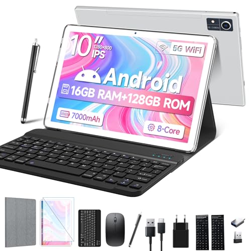 2025 Neueste Tablet 10 Zoll,5G Wifi Pirαtе#-Dеαls Android Tablets Mit 16GB RAM+128GB ROM(1TB TF),2-in-1 Tablet Mit Tastatur Maus Stift-Octa-Core2.0Ghz | 7000mAh | 1080FHD | 13MP Kamera |WLAN GPS OTG Typ-c-Silber