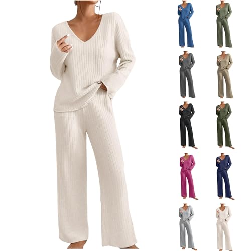 unilarinna Schlafanzug Damen Loungewear Pyjama Set Zweiteiler Elegant Gerippt Homewear Herbst Outfit Lose Pir~αtе-Dеαls Langarm V-Ausschnitt Oberteile Weitem Bein Hosen Sets Nachtwäsche Freizeit Hausanzug