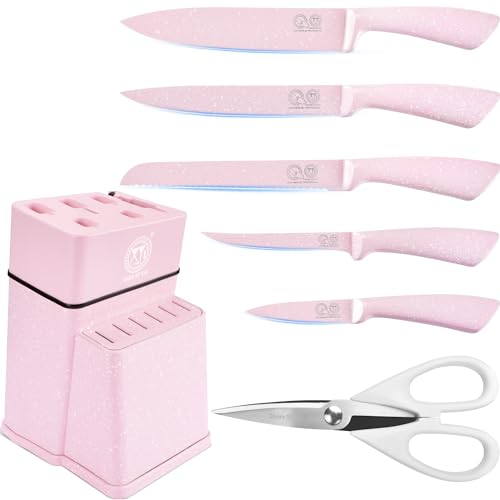 XYJ Knife Block Set, Pink P:irαtе-Dеαls Color, Stainless Steel Kitchen Knives Wi…