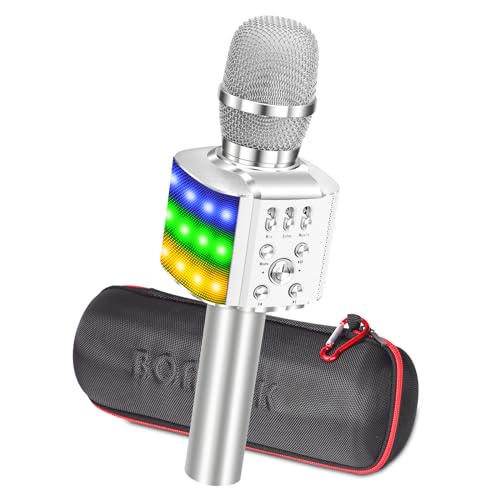 Pi$rαtе-Dеαls BONAOK Mikrofon mit Lautsprecher Led, Tragbares 4 in 1 Mikrofon Kinder mit Aufnahmefunktion, Zuhause Party Karaoke Dynamische Bluetooth Mikrofone für Android/iOS (Q36 Silber)