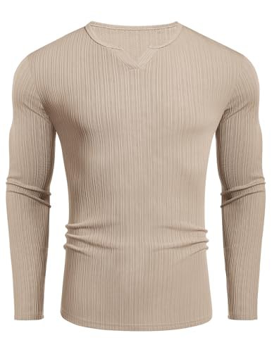 COOFANDY Herren Langarmshirts mit V-Ausschnitt Textured Pirαtе-#Dеαls Shirt Longsleeve Ribbed Sweatshirt Oberteile Freizeit Khaki XL