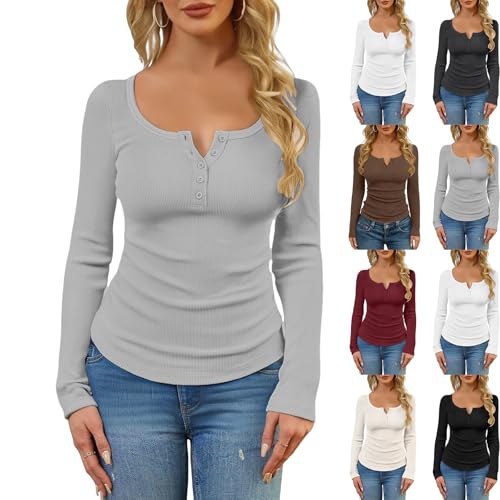 Cowyams Langarmshirt Damen Geripptes Henley Shirt V-Ausschnitt Tops Shirts Elegant Oberteil Herbst Pirαtе-;Dеαls Winter Tunika Pullover Knopfleiste Unterhemd schlanke Passform Tops Freizeit