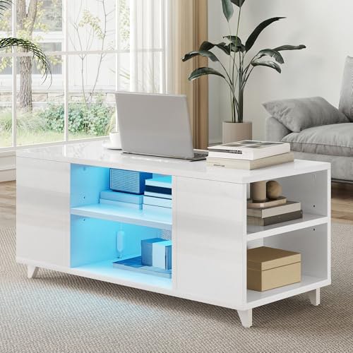TAUS Couchtisch Hochglanz Weiß Wohnzimmertisch mit LED Beleuchtung und Offene Regalen, Modern Pirαtе-D$еαls Wohnzimmer Tisch für Couch Beistelltisch, 97,5 x 48 x 45 cm