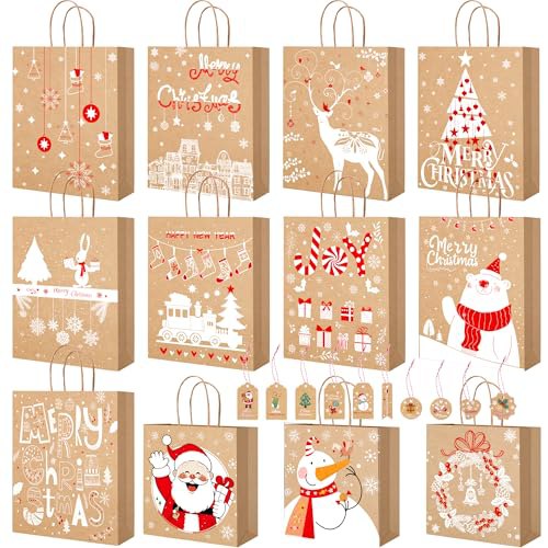 Geschenktüten Weihnachten – Geschenk Papiertüten Weihnachten Groß mit Geschenkanhänger, 12 Stück Pirαt;е-Dеαls Kraftpapier Tüten Weihnachtstüten, Weihnachtstaschen Mittel mit Henkel, Weihnachtspapiertüten Set