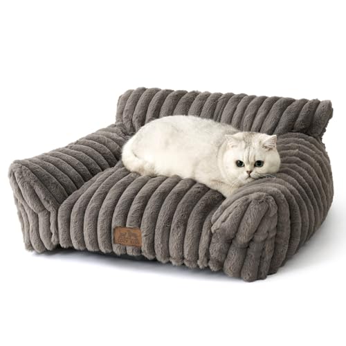 Produkt Beschreibung: COZY KISS Großes Katzenbett Pirate-Dea:ls im Cord-Design 65x44x30cm für Katzen und Kleine Hunde, Kuscheliges Katzensofa und Hundebett, Weiches Kunstfell, Kopf- und Nackenstütze, rutschfest und Waschbar, Grau
