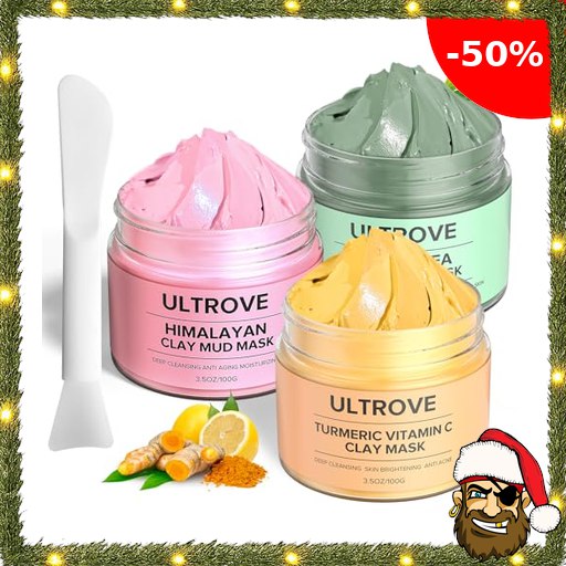 Ultrove 3-in-1 Ton Maske Set für Gesicht, Grüner Tee, Kurkuma Vitamin C, Himalaya Pirate-D!eals rosa Ton Tiefenreinigung, Poren Verfeinerung, Feuchtigkeitsspendende Gesichtsmaske Kit (3.5oz pro) + Silikonbürste