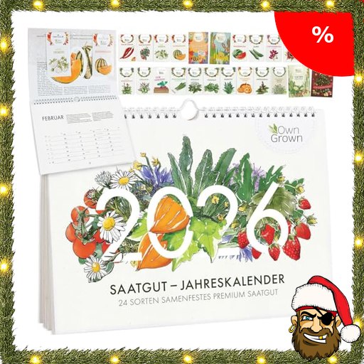 OwnGrown Saatgut Kalender 2026 Wandkalender A4 – Gartenkalender mit 24 Pirate-#Deals Sorten Samen – Monatskalender für Kräuter, Gemüse, Obst, Blumen – Adventskalender 2026 Frauen und Männer