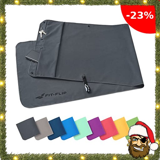 Fit-Flip Fitness Handtuch Pirate-De$als aus Mikrofaser – mit Magnet und Reißverschluss Tasche – Fitnesshandtuch für Sport und Gym – Kompakt & Schnelltrocknend – Sporthandtuch Fitnessstudio – Dunkelgrau – 130x48cm