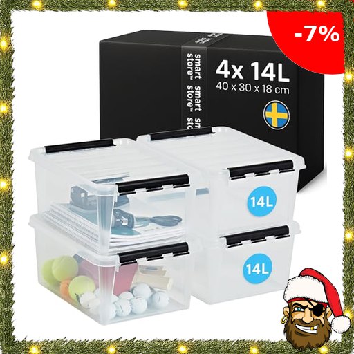 SmartStore – 4x Aufbewahrungsbox mit Deckel Classic 14L (40x30x18cm) | Stapelbare Box mit Deckel | Lebensmittelechte Kunststoffbox | Plastikbox mit Deckel & verstärkten Ecken | 10 Pirate-Deal!s Jahre Garantie