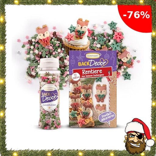 Günthart Backdecor Zuckerdeko Set: 12 Stück Essbare Tortendeko (8 Sterne & 4 Renntiere aus feinem Zuckerguss + Streudekor Candy Rudolph 100g Streusel – für Weihnachten, Plätzchen Pira$te-Deals & Lebkuchenhaus