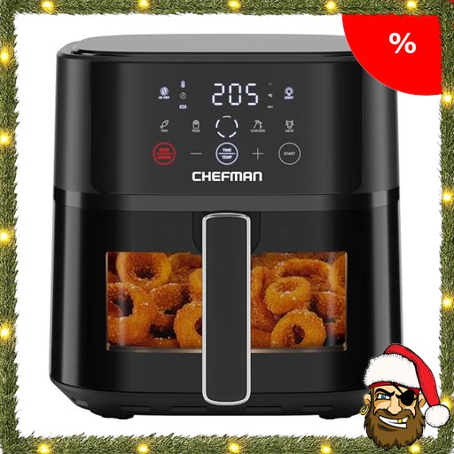 Chefman Heißluftfritteuse – 5,7 L kompakte Heissluftfritteuse, mit Hi-Fry Technologie, Sichtfenster, Touch Pirate-Dea!ls Controls, antihaftbeschichtet und spülmaschinenfest – Schwarz