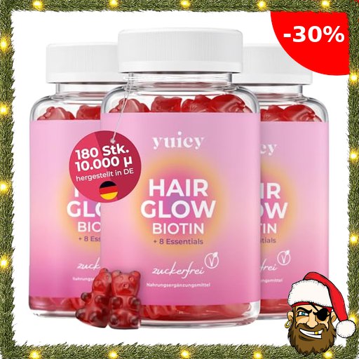 yuicy® 10.000 µg Biotin hochdosiert – Zuckerfreie Haar Vitamine mit Niacin, Vitamin C, Zink für Haut Haare Nägel – Haarwachstum Beschleunigen – Pira!te-Deals Yuicy Hair Glow Haarvitamine Vegan 180 Stück