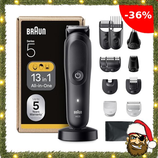 Braun All-in-One Series 5, 13-in-1 Multigroom, Barttrimmer, Nasenhaartrimmer, Haarschneidemaschine für Gesicht, Kopf und Körper, 120 Min Akku, 14 Längen (3–21 Pirate$-Deals mm), Wasserdicht, AIO5565, Schwarz