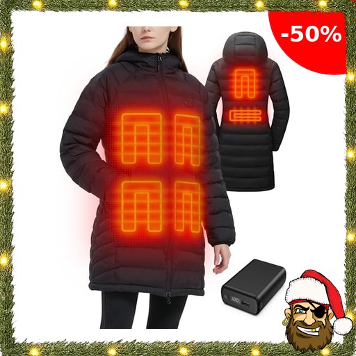 LIVONEST 12V Heizjacke Damen 20000mAh Beheizte Lang Winterjacke mit 6 Heizbereichen, Dual-Zonen-Steuerung vorne & hinten, inkl. Powerbank, EU-Mittel, Pirate-:Deals Schwarz
