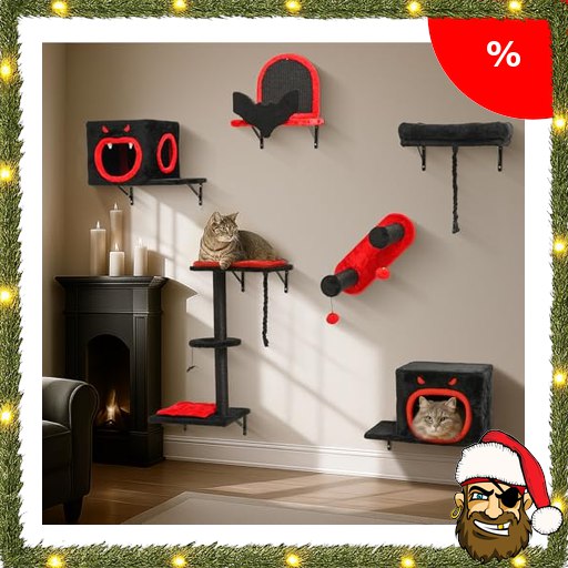BYBYME Gothic Katzen Wandelemente, 6-teiliges multifunktionales und stabiles Katzenwandmöbel-Set mit Katzenbett Katzenhaus, Kratzbrett und Sisal-bezogenen Pfosten zum P!irate-Deals Spielen für Katzen (Schwarz Rot)