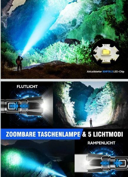 Taschenlampe LED Aufladbar 1000000 Lumens, XHP70.2 Extrem Hell Hohe Helligkeit Zoombar Taschenlampen Starke mit 5 Lichtmodi, IP67 Wasserdichte Flashlight Torch P$irate-Deals für Camping, Wandern, Outdoor, Notfäll