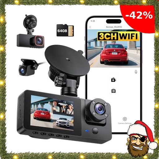 Bestsee 2.5K Dashcam Auto Vorne Hinten und Innen, 2,35″ IPS-Bildschirm Dashcam Auto, mit 64GB Pira!te-Deals SD-Karte, 24H Parküberwachung, WDR Nachtsicht, G-Sensor, Loop-Aufnahme, Sichtwinkel(170°+150°+150°)
