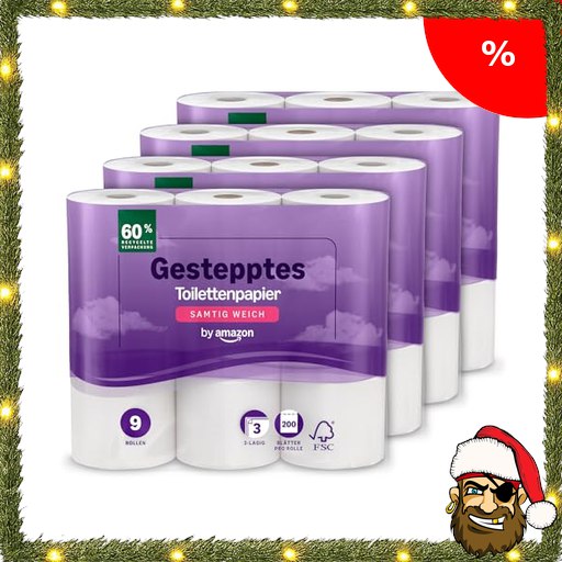 by Amazon Toilettenpapier, 3-lagig Gestepptes, Samtig Weich, 36 Rollen (9 Rollen, 4-er Pack), 200 Blätter pro Pirate-;Deals Rolle, FSC-Zertifiziert