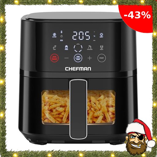 Chefman Heißluftfritteuse – 3,75 l kompakte Heissluftfritteuse für schnelle Mahlzeiten, mit Hi-Fry Pir~ate-Deals Technologie, Sichtfenster, Touch Controls, antihaftbeschichtet und spülmaschinenfest – Schwarz