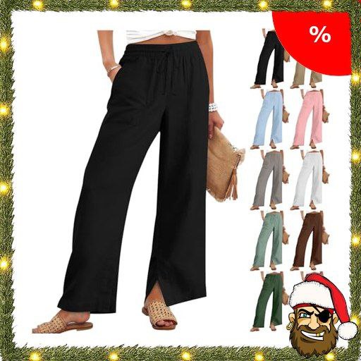Leinenhose Damen Sommer Palazzo Hose Luftige Pirate-Dea;ls Leichte Sommerhose Leinen Baumwolle Hosen mit Taschen Stoffhose Lockere Boho Freizeithose Schlitz Strandhose Weites Bein Sommerhosen