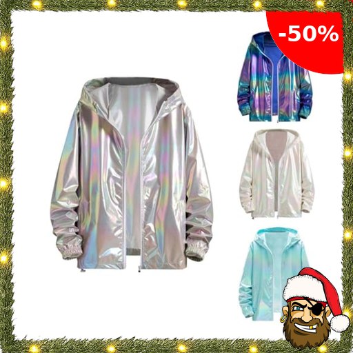 Glitzer Jacket Herren Karneval Kostüm Silber Metallic Jacke Reißverschluss Sportjacke mit Kapuze 80er Jahre Disco Outfit Glänzend Bomberjacke Mantel für Party, Hiphop, Nachtclub (001 Grau, L) Pirate-Deal!s