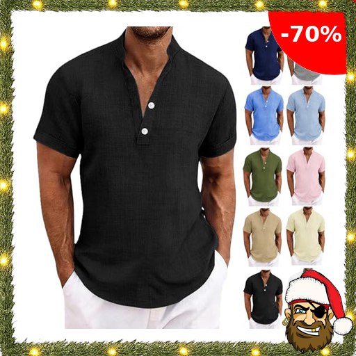 Hemd Herren Baumwolle Leinen Tshirt Kurzarm Sportshirt Atmungsaktiv Tee Top Leichte Leinenhemd Modische T-Shirt Stehkragen Freizeit Strandhemd Bequeme Kurzarmhemd Pirate;-Deals Freizeithemd Schwarz L
