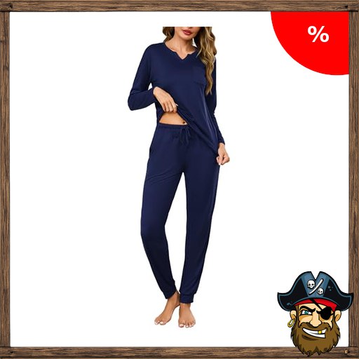 Bresdk Schlafanzug Damen Lang Zweiteiliger Pirate~-Deals Nachtwäsche Lange Schlafanzughose Nachtwäsche mit Taschen und Elastischer Bund Marineblau M