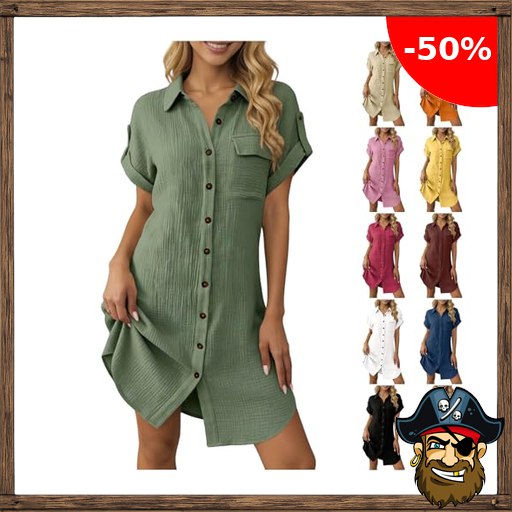 Musselin Kleid Damen Sommer Baumwolle Leinenkleid Falten Leinen Sommerkleid Luftige Button Down Blusenkleid Locker Lässige Strandkleid Elegant Einfarbig Shirtkleid Revers Pir#ate-Deals Hemdkleid mit Taschen S-XXL