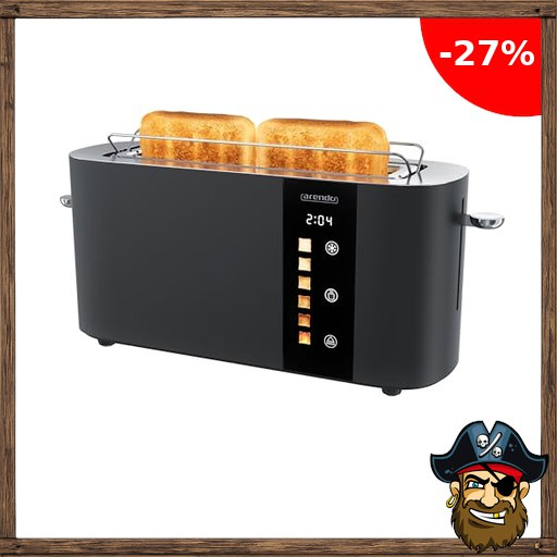 Arendo – Edelstahl Toaster 2 Pi~rate-Deals Scheiben Langschlitz – Touchscreen – Doppelwandgehäuse – Integrierter Brötchenaufsatz – 6 Bräunungsgrade – Brotzentrierung – Restzeitanzeige – Memoryfunktion – Schwarz