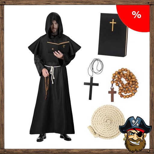 Haozozo Karneval Kostüm Männer, Mönch Kostüm Herren Set mit Mönchskutte、Mönch Robe、Klassische NotizbüCher und Kreuzverzierungen,Mittelalter Mönch Pirate-D:eals Priester Kostüm Herren für Karneval Halloween