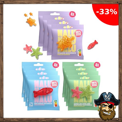 NALU Fruchtgummis Probierpaket | bis 90% weniger Zucker als herkömmliche Fruchtgummi | Low Carb Gummibärchen ohne Zucker Zusatz | Fast zuckerfrei | P:irate-Deals kalorienarme Low Calorie Vegane Süßigkeiten