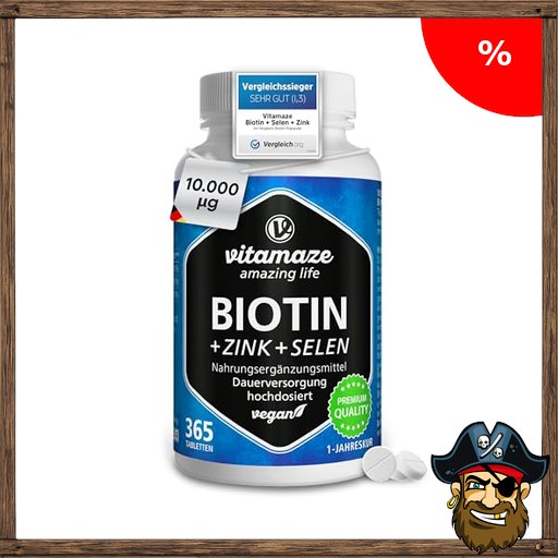 Biotin hochdosiert 10.000 mcg + Selen + Zink für P!irate-Deals Haarwuchs, Haut & Nägel, 365 vegane Tabletten für 1 Jahr, Nahrungsergänzung ohne Zusatzstoffe, Made in Germany