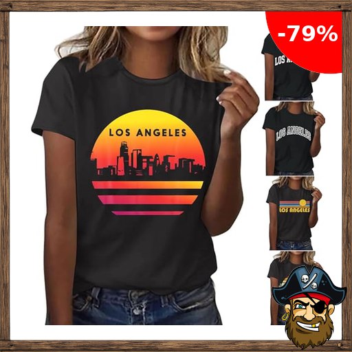 KOG Los Angeles Tshirt Damen T Shirts Kurzarm Oberteile Grafik Drucken Arbeitsshirt Strand Baumwolle Wandershirt Frauen Bekleidung Elegant Pirate-Deal$s Tunika Frau Elegante Kleidung Schwarz S