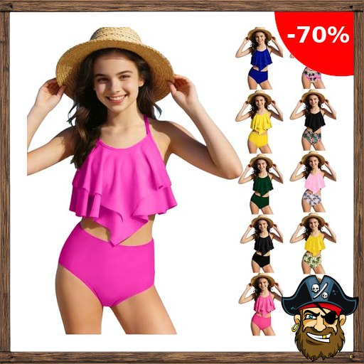 Mädchen Bikini Set Badeanzug 2-Teilig Rüschen Badeshirt und High Taille Pirate-D…