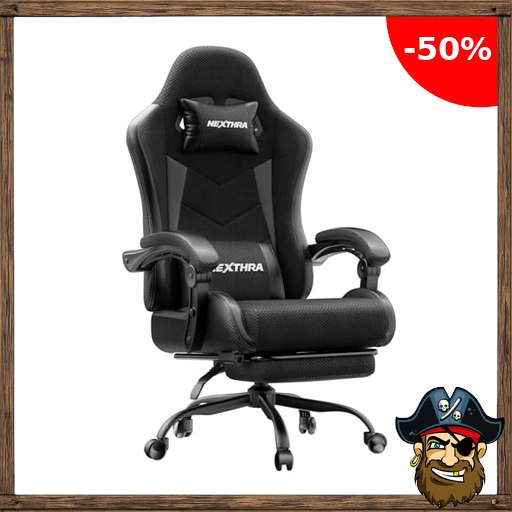 Nexthra Gaming Stuhl Bürostuhl Gaming Sessel mit höhenverstellbaren Linkage-Armlehnen, ergonomischer Gamer Stuhl mit Pir$ate-Deals Fußstütze, gepolstert Gaming Chair 150° neigbar bis 180 kg, Schwarz