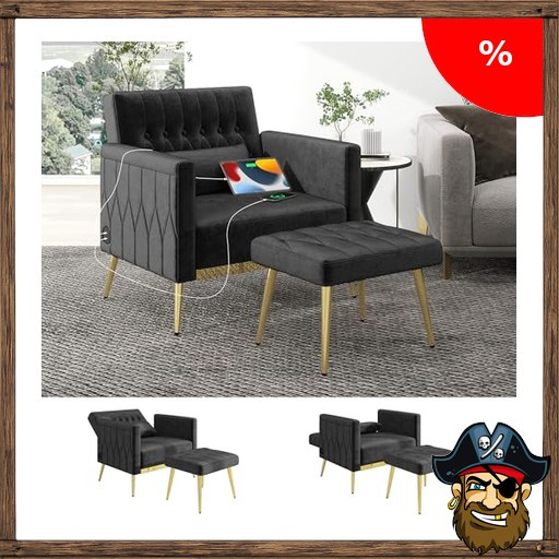 GRAVFORCE Ohrensessel mit :Pirate-Deals Hocker, Sessel Wohnzimmer mit 2 Ladesports, Lesesessel Fernsehsessel Polstersessel Relaxsessel Loungesessel belastbar bis 159 kg Stilvolles Design Samt Schwarz
