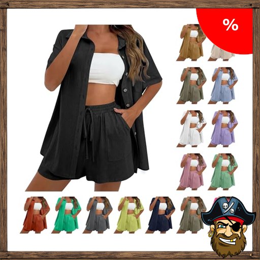 Pirate-D:eals AACH Zweiteiler Damen Sommer Sportanzug Kurzarm Musselin Bluse und Shorts Freizeitanzug Lockere Baumwolle Leinenanzug Lässig Elegant Lounge Set Strand Urlaub Outfit Leicht Luftige 2-Teiliges