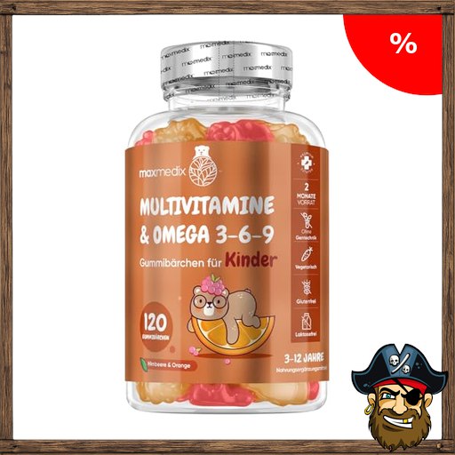 Multivitamin Gummibärchen für Kinder – Mit Omega 3 6 9, Vitamin C – 120 Multivitamin Kinder Pirate-Dea:ls Gummies – Vitamin D3, B7, B12, E, B1, B2, B3, B5, B9 Jod, Zink – Mit Himbeer & Orangengeschmack – maxmedix