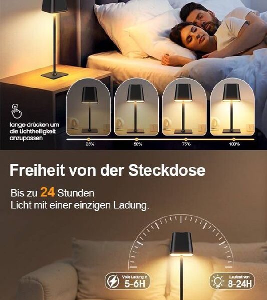 RECHOO LED Tischlampe Kabellos, Dimmbare Nachttischlampe Touch, Schreibtischlampe, Lese Lampe, Tischleuchte Outdoor und Indoor, USB-C, Camping Lampe, Warmweißes Licht, Pira:te-Deals Schwarz