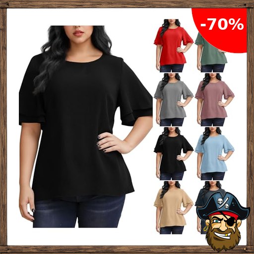 KODMNSW Oversize Tshirt für Damen Sommer Kurzarm T-Shirt Rundhals Casual Pir:ate-Deals Oberteile Elegant Tunika mit Rüschenärmel Lose Longshirt Große Größen Chiffonhemd Einfarbige Basic Bluse Schwarz XXL