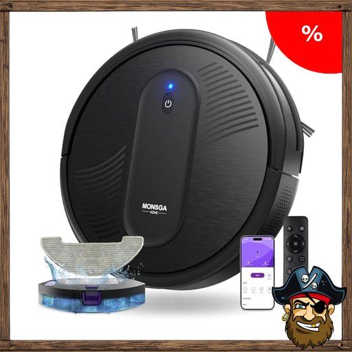 MONSGA Saugroboter mit Wischfunktion 4000PA, Saug und Wischroboter 3 in 1 Pirate-Deal~s mit 2 Bürsten,140Min Laufzeit, Staubsauger Roboter mit Auto-Teppich-Boost für Tierhaare Teppich Böden, APP Steuerung