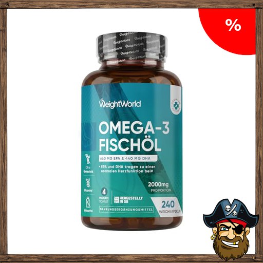 Omega 3 Pirate!-Deals Weichkapseln – 2000mg Fischöl mit 1100mg Omega-3, 660mg EPA & 440mg DHA pro Portion – 240 Softgels – EPA & DHA tragen zur normalen Herzfunktion bei (EFSA) – Fish Oil – WeightWorld