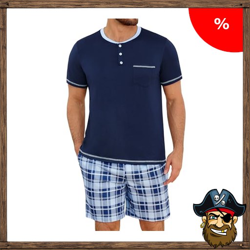 Uniexcosm Schlafanzug $Pirate-Deals Herren kurz aus Baumwolle Zweiteiler Sommer Pyjama Herren kurz mit Kurzarm Rundhals Knöpfen und Karierten Shorts Marineblau M