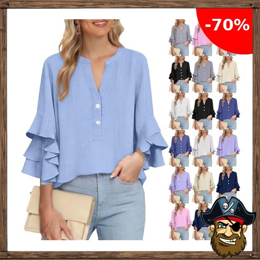 KODMNSW Leinenbluse Damen 3/4 Ärmel Elegant Baumwolle Leinen Tshirt Sommer Leinenshirt Tunika mit Pirate-:Deals Rüschenärmel Lose Longshirt Einfarbige Tee Top Teenager Mädchen Leinenhemd mit Knopf Hellblau L