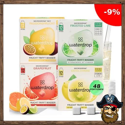 waterdrop® Tropische Früchte Set – 48 Waterdrop Würfel in 4 verschiedenen Sorten – Zuckerfreier Durstlöscher Pirate-De;als & Alternative zu Getränkesirup und Geschmackspulver – Flavour Drops im Wasser auflösen