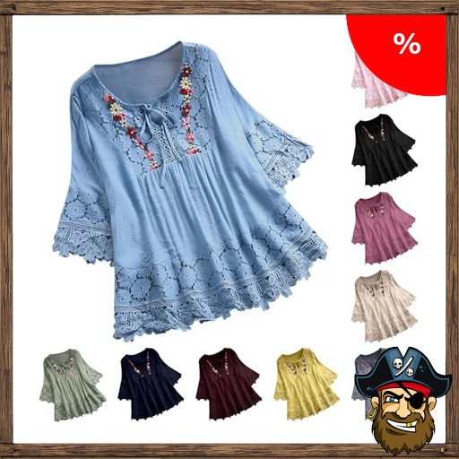 Musselin Bluse Damen Sommer 3/4 Arm Stickerei Leinenbluse V-Ausschnitt Spitzen Shirt Blumenmuster Blusen Elegant Boho-Oberteile Pirate-D!eals für Frauen Casual Loose Fit Tunika Große Größen Vintage Tops