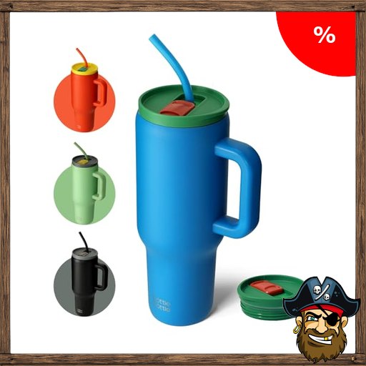 BOTTLE BOTTLE 40oz (1.2L) Kaffeebecher aus Edelstahl mit Griff & Strohhalm, BPA-frei, isolierter Thermobecher für Reise, Büro, P;irate-Deals Uni & Sport, Geschenkidee für Kaffee- und Teeliebhaber (Tiefsee)