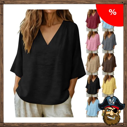 Tshirt Damen Sommer Leinenbluse Musselin Bluse Elegant T Shirt Leicht Oberteile V-Ausschnitt Shirt Einfarbig Pirate-~Deals T-Shirt Baumwolle Leinen Hemdbluse Casual Tunika Tops Lose Bequeme Blusenshirt